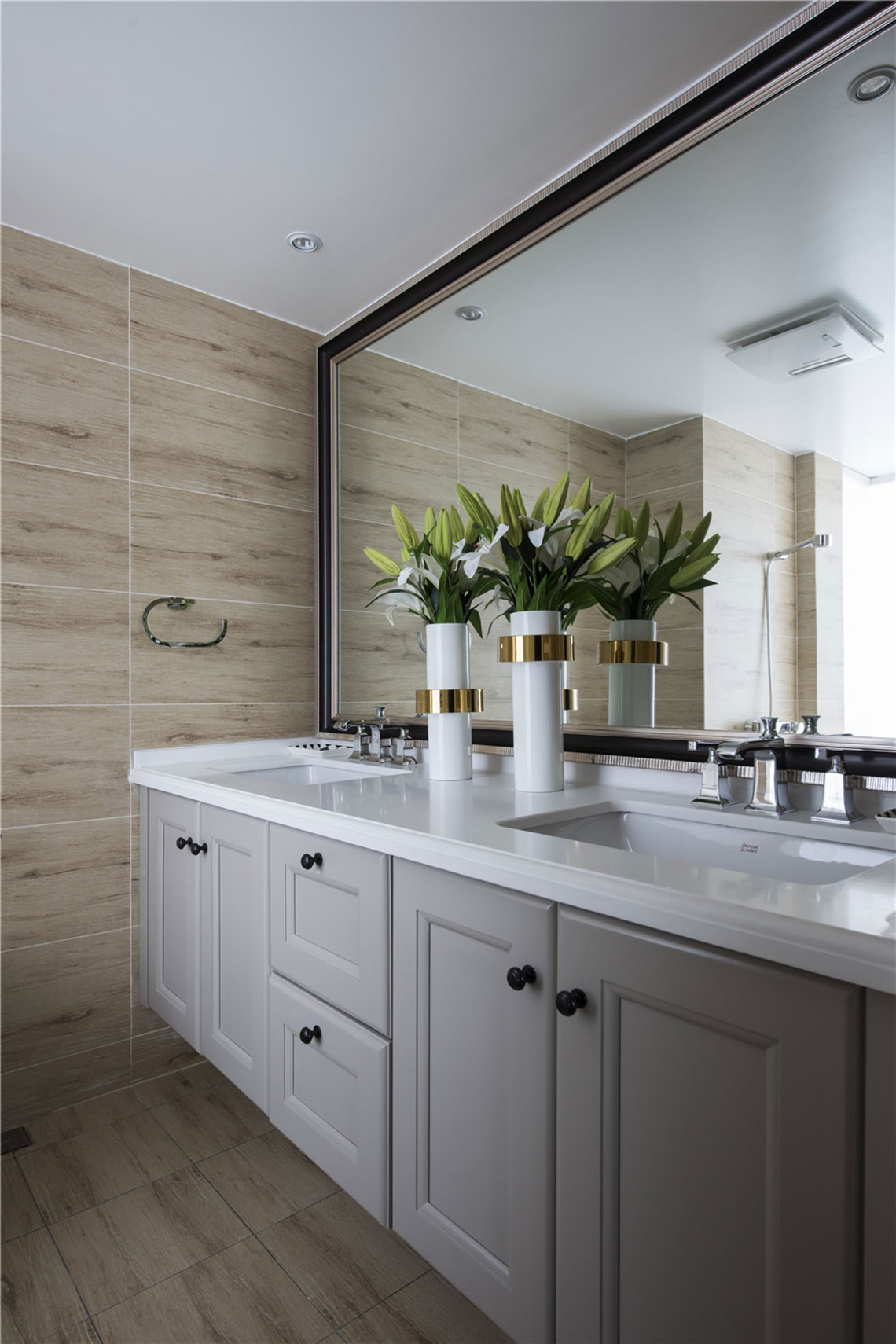 本案全屋采用奧地利凱得集團(tuán)的拉菲系列4054環(huán)保木地板進(jìn)行鋪裝,優(yōu)雅自持的深灰色表面,讓一切喧囂歸于靜止,刀鋸紋理流露出自然的美感,整個(gè)空間就是原始之美與精致的現(xiàn)代化生活的完美結(jié)合。