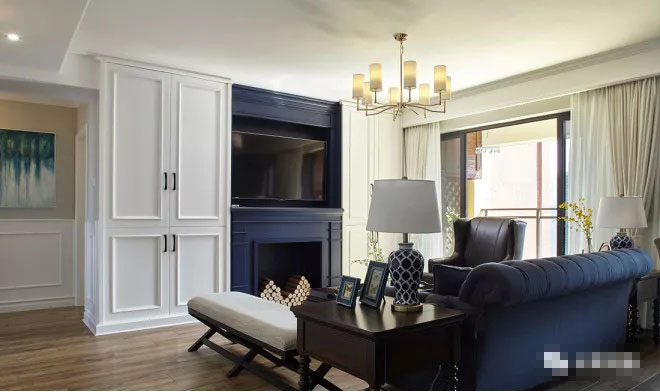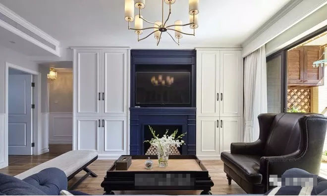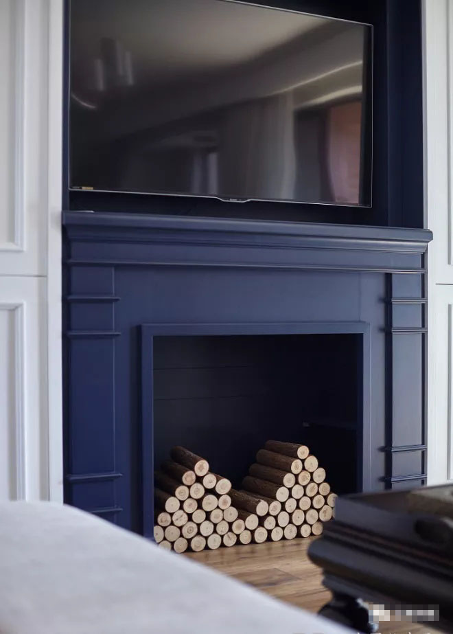 靛藍色的壁爐與沙發(fā)的顏色相呼應,使空間更具有連貫性。