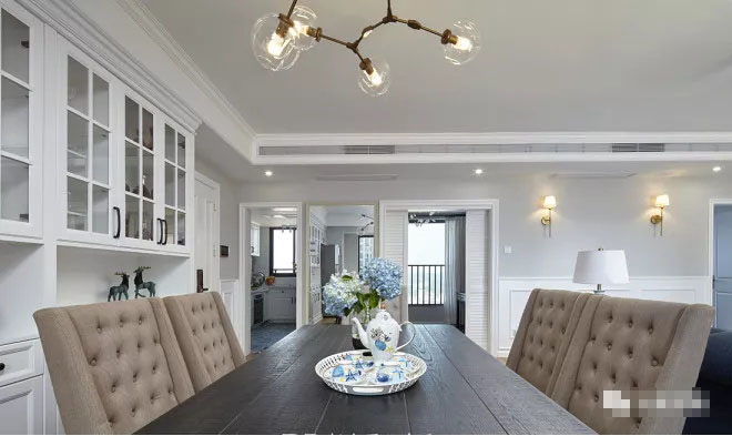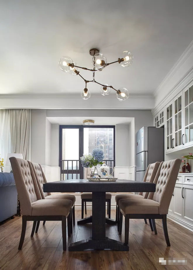 餐廳形態(tài)略顯夸張的分子吊燈與實木餐桌和布藝拉扣餐椅塑造了一個大氣不失時尚的用餐環(huán)境。