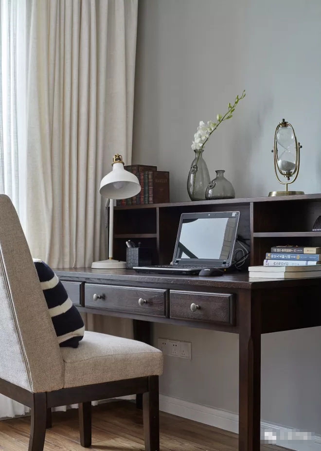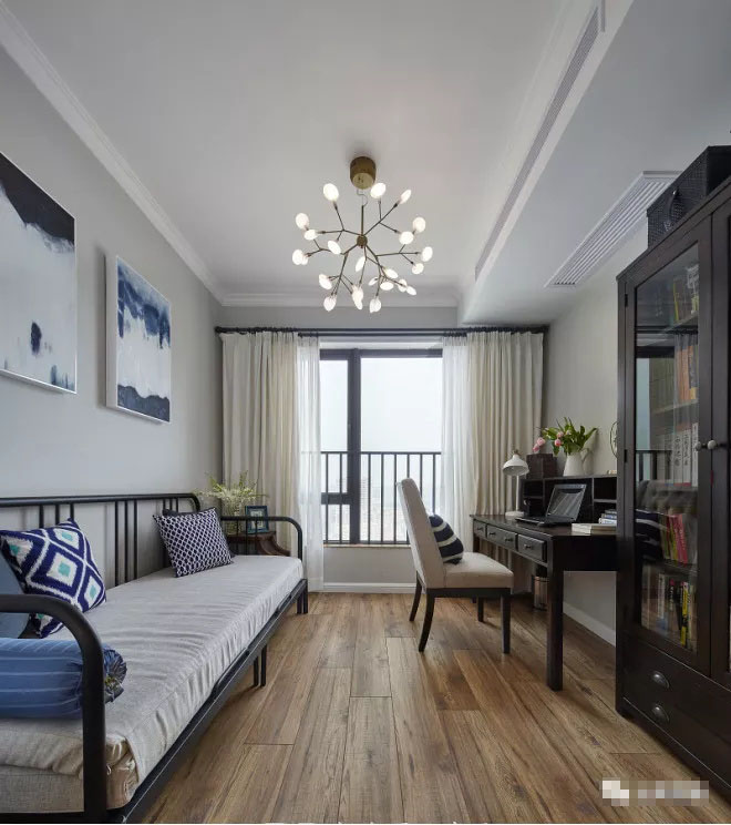 實木的書柜里井然有序地擺放著各類書籍,體現(xiàn)了主人的愛好,米色的窗簾和鐵藝的沙發(fā)床,讓整個書房輕松愜意。