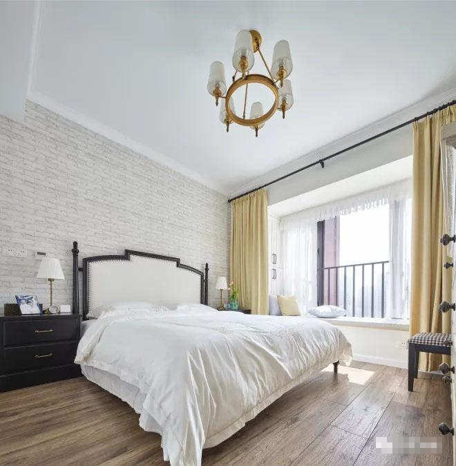 臥室以黑白色為主色調(diào),加以黃色為點綴,讓整個空間靈動而又唯美。床頭背景墻上的仿文化石的墻紙,讓空間更富有底蘊。