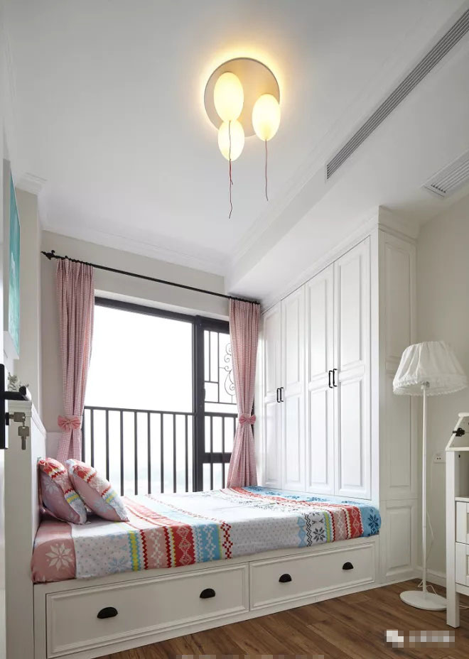 小孩房以白色為主,在局部加以粉色點綴,氣球形的吸頂燈,讓空間充滿趣味。
