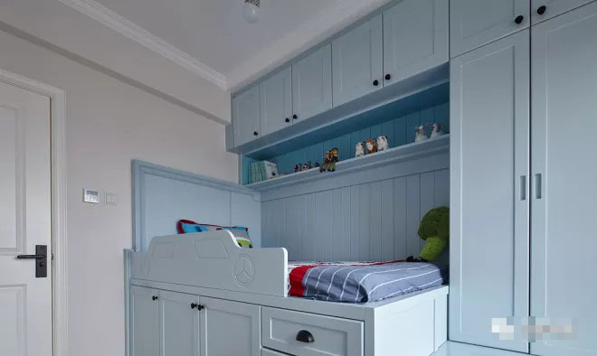 男孩房以藍白色為主色調(diào),使整個空間潔凈溫馨,以汽車造型為模型定制的小孩床,既充滿童趣,還增加了儲物功能。