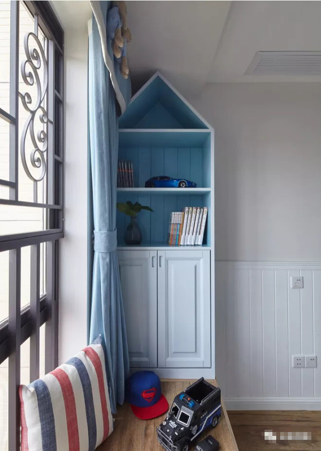 兒童房的收納柜沒有做成到頂?shù)?,而是在上面做了一個小房子的造型,營造了空間的趣味性。