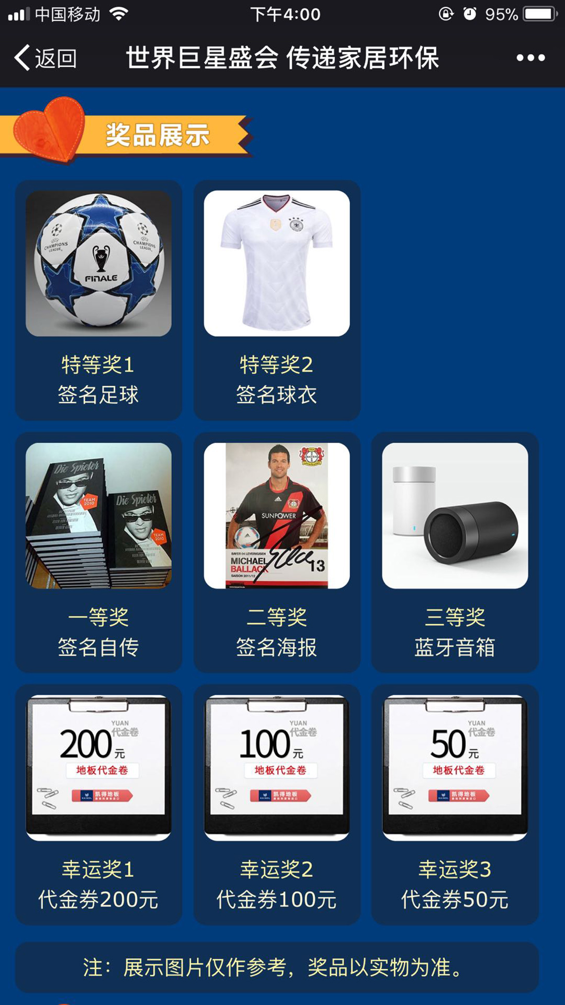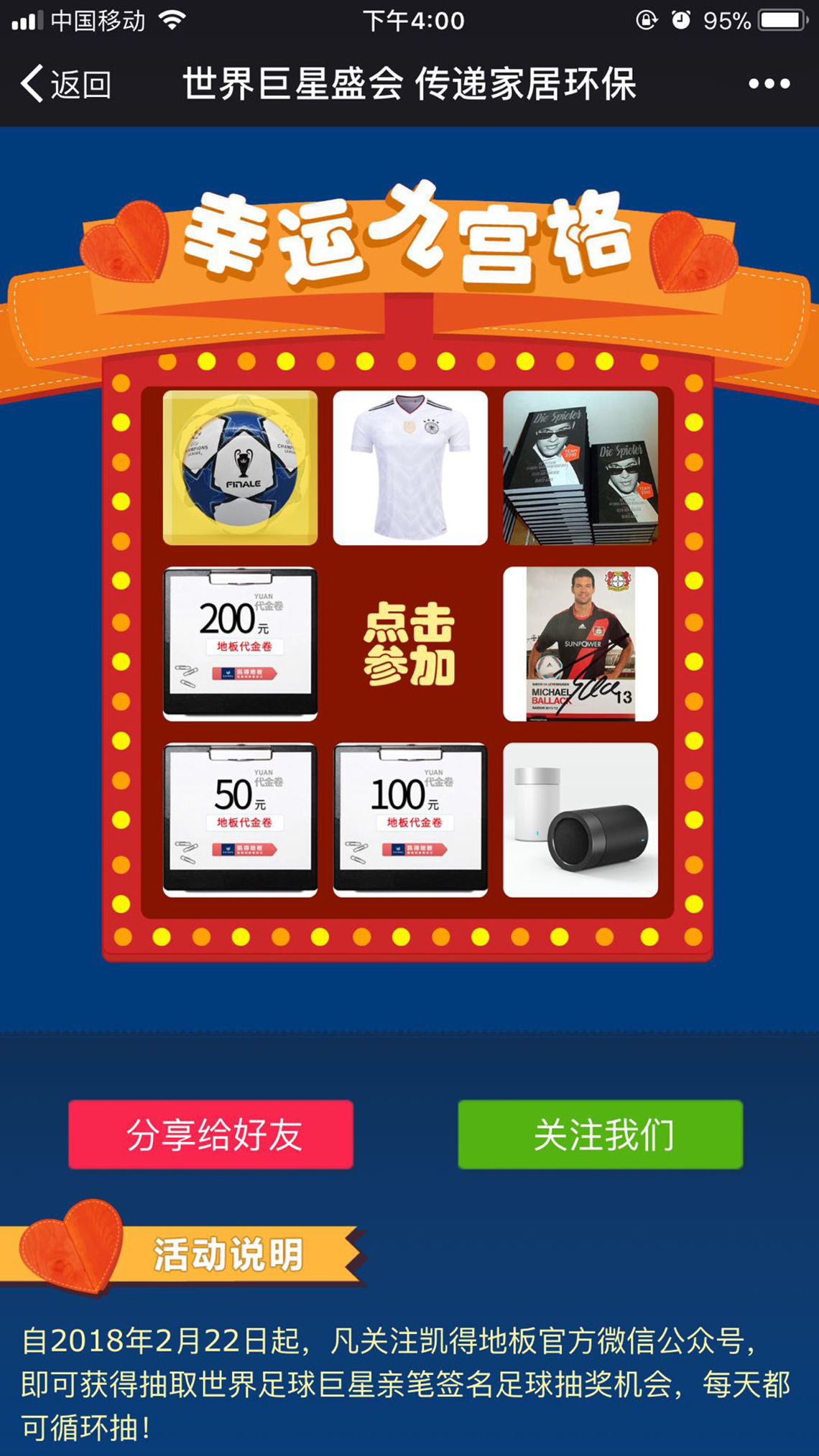 在2月至3月期間,凱得地板為廣大球迷準備了多項驚喜活動。第一波福利是巴拉克周邊紀念物大抽獎!自2月22日零時起至3月26日零時,凡關(guān)注凱得地板官方微信公眾號“凱得地板KAINDL”,點擊“巨星盛會”版塊參與活動,即可獲得世界足球巨星親筆簽名足球、球衣等抽獎機會,并且每天都可循環(huán)抽取哦!用足球敲開2018年的幸運大門,凱得地板和巴拉克在上海等您赴約!